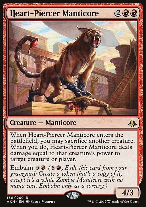 When Heart-Piercer Manticore enters the battlefield, you may sacrifice another creature. When you do, Heart-Piercer Manticore deals damage equal to that creature's power to any target.