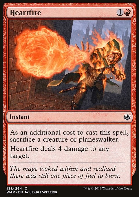 As an additional cost to cast this spell, sacrifice a creature or planeswalker. Heartfire deals 4 damage to any target.