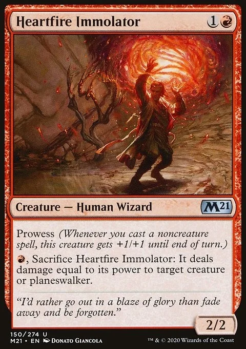 Prowess (Whenever you cast a noncreature spell, this creature gets +1/+1 until end of turn.) {R}, Sacrifice Heartfire Immolator: It deals damage equal to its power to target creature or planeswalker.