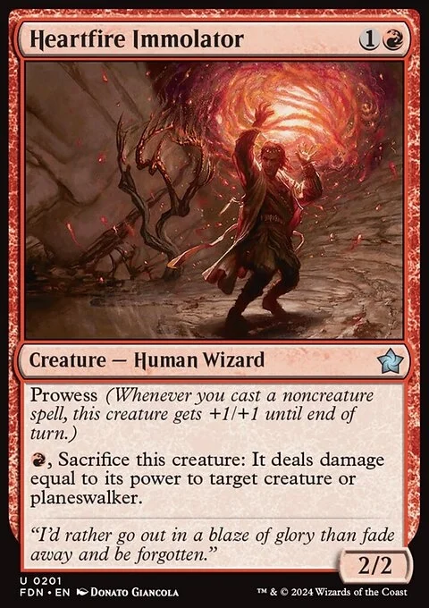Prowess (Whenever you cast a noncreature spell, this creature gets +1/+1 until end of turn.) {R}, Sacrifice this creature: It deals damage equal to its power to target creature or planeswalker.