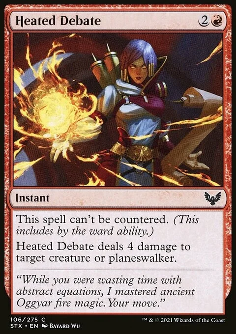 This spell can't be countered. (This includes by the ward ability.) Heated Debate deals 4 damage to target creature or planeswalker.