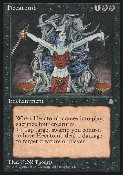 When Hecatomb comes into play, sacrifice four creatures.0: Tap target swamp you control to have Hecatomb deal 1 damage to target creature or player.