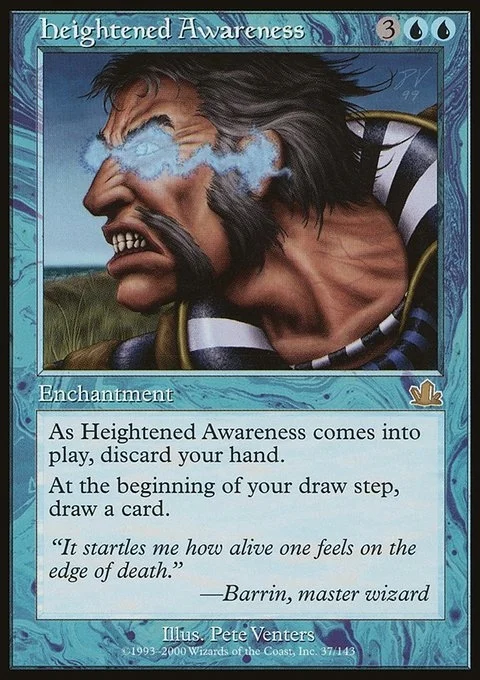 As Heightened Awareness enters the battlefield, discard your hand. At the beginning of your draw step, draw an additional card.