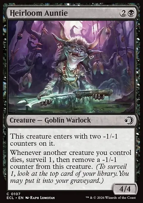 This creature enters with two -1/-1 counters on it. Whenever another creature you control dies, surveil 1, then remove a -1/-1 counter from this creature. (To surveil 1, look at the top card of your library. You may put it into your graveyard.)