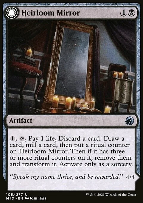 {1}, {T}, Pay 1 life, Discard a card: Draw a card, mill a card, then put a ritual counter on Heirloom Mirror. Then if it has three or more ritual counters on it, remove them and transform it. Activate only as a sorcery.