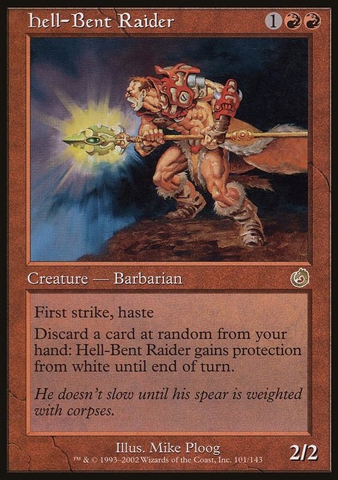 First strike, haste Discard a card at random: Hell-Bent Raider gains protection from white until end of turn.