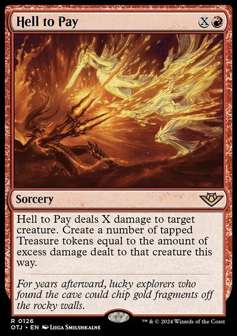 Hell to Pay deals X damage to target creature. Create a number of tapped Treasure tokens equal to the amount of excess damage dealt to that creature this way.