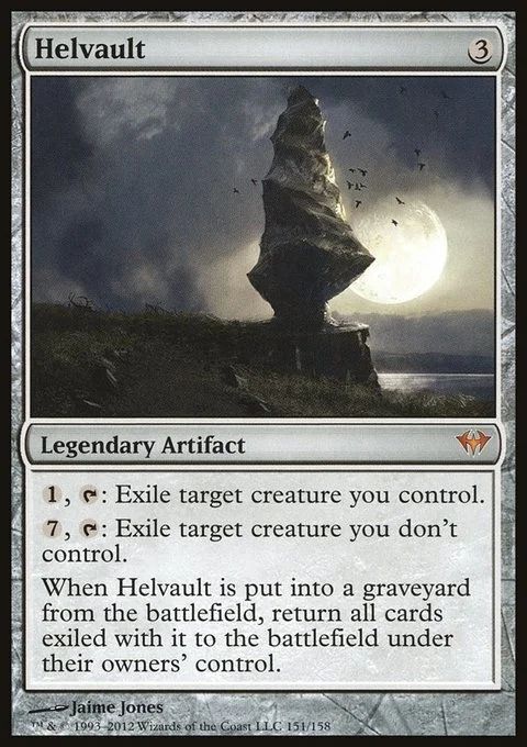 {1}, {T}: Exile target creature you control. {7}, {T}: Exile target creature you don't control. When Helvault is put into a graveyard from the battlefield, return all cards exiled with it to the battlefield under their owners' control.