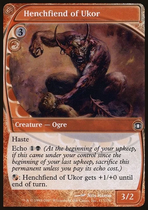 Haste Echo {1}{B} (At the beginning of your upkeep, if this came under your control since the beginning of your last upkeep, sacrifice it unless you pay its echo cost.) {B/R}: Henchfiend of Ukor gets +1/+0 until end of turn.
