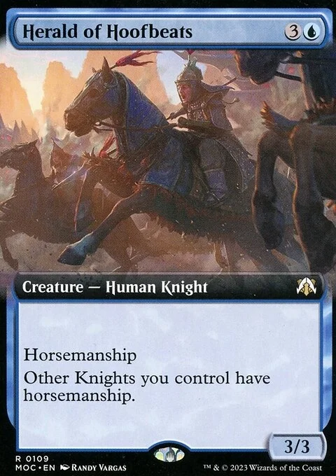 Horsemanship (This creature can't be blocked except by creatures with horsemanship.) Other Knights you control have horsemanship.