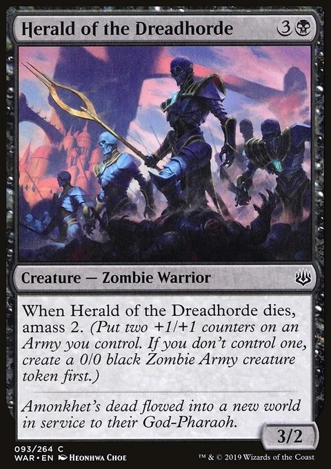When Herald of the Dreadhorde dies, amass 2. (Put two +1/+1 counters on an Army you control. If you don't control one, create a 0/0 black Zombie Army creature token first.)