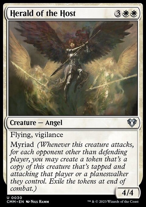 Flying, vigilance Myriad (Whenever this creature attacks, for each opponent other than defending player, you may create a token copy that's tapped and attacking that player or a planeswalker they control. Exile the tokens at end of combat.)