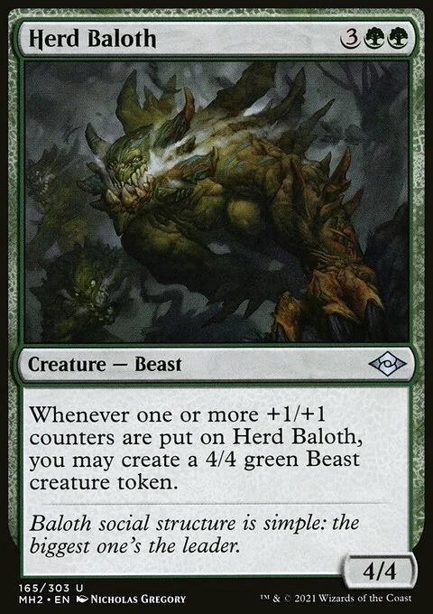 Whenever one or more +1/+1 counters are put on Herd Baloth, you may create a 4/4 green Beast creature token.