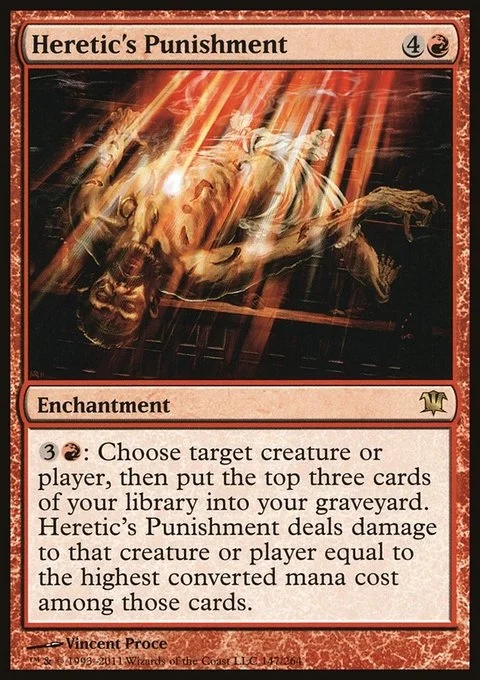 {3}{R}: Choose any target, then put the top three cards of your library into your graveyard. Heretic's Punishment deals damage to that permanent or player equal to the highest converted mana cost among those cards.