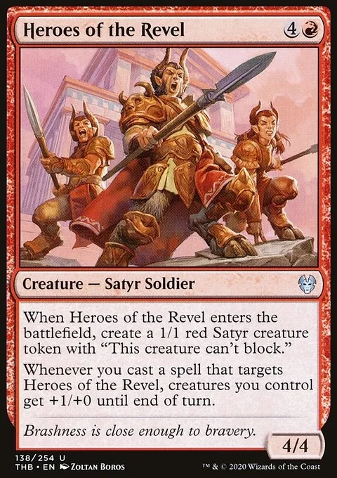When Heroes of the Revel enters the battlefield, create a 1/1 red Satyr creature token with "This creature can't block." Whenever you cast a spell that targets Heroes of the Revel, creatures you control get +1/+0 until end of turn.