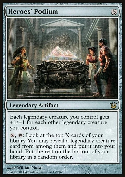 Each legendary creature you control gets +1/+1 for each other legendary creature you control. {X}, {T}: Look at the top X cards of your library. You may reveal a legendary creature card from among them and put it into your hand. Put the rest on the bottom of your library in a random order.