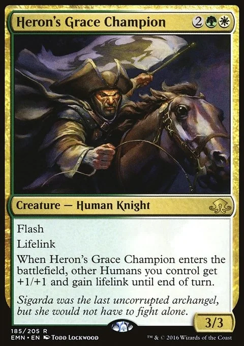 Flash Lifelink When Heron's Grace Champion enters the battlefield, other Humans you control get +1/+1 and gain lifelink until end of turn.