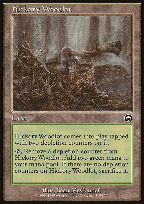 Hickory Woodlot enters the battlefield tapped with two depletion counters on it. {T}, Remove a depletion counter from Hickory Woodlot: Add {G}{G}. If there are no depletion counters on Hickory Woodlot, sacrifice it.