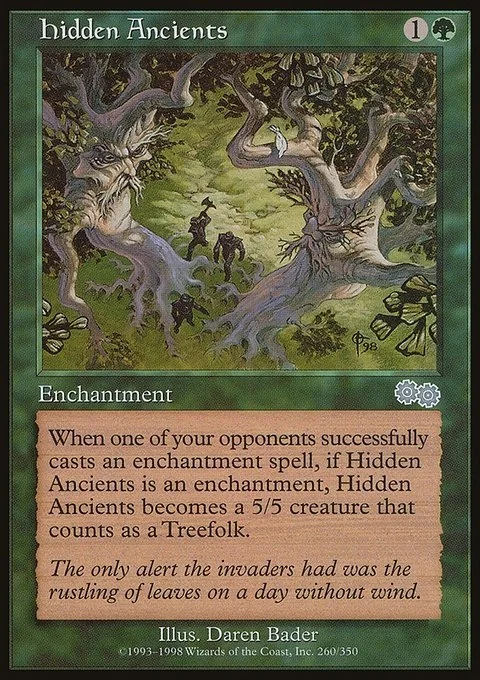 When one of your opponents successfully casts an enchantment spell, if Hidden Ancients is an enchantment, Hidden Ancients becomes a 5/5 creature that counts as a Treefolk.
