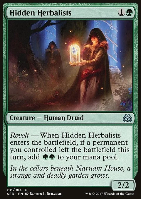 Revolt — When Hidden Herbalists enters the battlefield, if a permanent you controlled left the battlefield this turn, add {G}{G}.