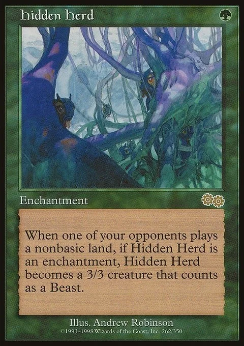 When one of your opponents plays a nonbasic land, if Hidden Herd is an enchantment, Hidden Herd becomes a 3/3 creature that counts as a Beast.