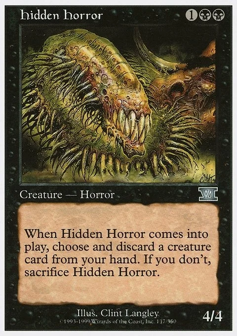 When Hidden Horror comes into play, choose and discard a creature card from your hand. If you don’t, sacrifice Hidden Horror.