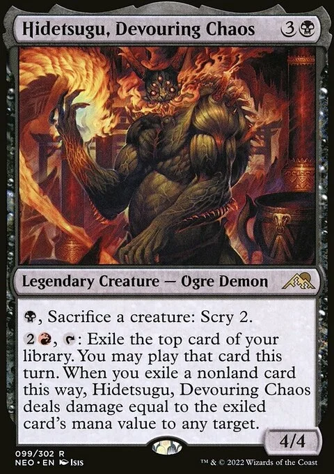 {2}{R}, {T}: Exile the top card of your library. You may play that card this turn. When you exile a nonland card this way, Hidetsugu, Devouring Chaos deals damage equal to the exiled card's mana value to any target.
