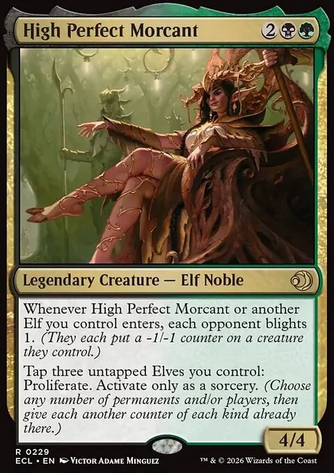 Whenever High Perfect Morcant or another Elf you control enters, each opponent blights 1. (They each put a -1/-1 counter on a creature they control.)