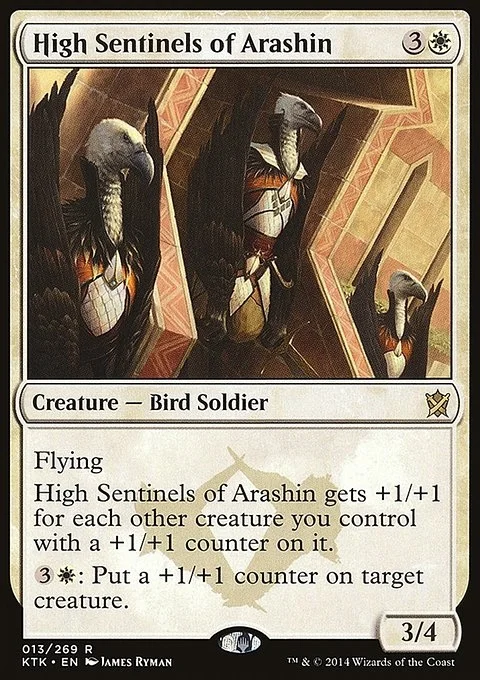 Flying High Sentinels of Arashin gets +1/+1 for each other creature you control with a +1/+1 counter on it. 3W: Put a +1/+1 counter on target creature.d