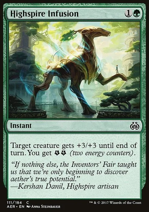 Target creature gets +3/+3 until end of turn. You get {E}{E} (two energy counters).