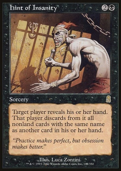 Target player reveals their hand. That player discards all nonland cards with the same name as another card in their hand.