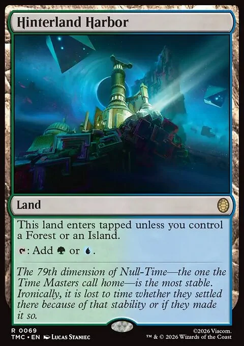 This land enters tapped unless you control a Forest or an Island. {T}: Add {G} or {U}.