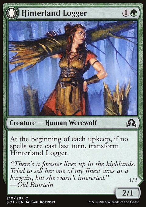 Hinterland Logger At the beginning of each upkeep, if no spells were cast last turn, transform this creature. Timber Shredder Trample At the beginning of each upkeep, if a player cast two or more spells last turn, transform this creature.