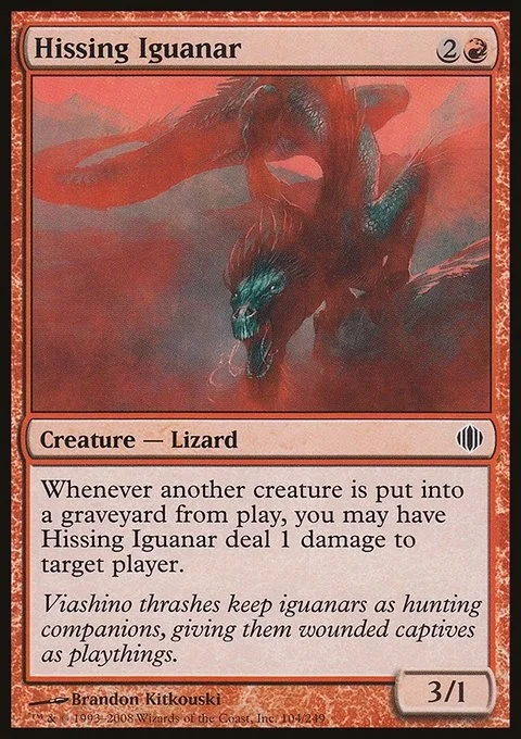 Whenever another creature dies, you may have Hissing Iguanar deal 1 damage to target player or planeswalker.