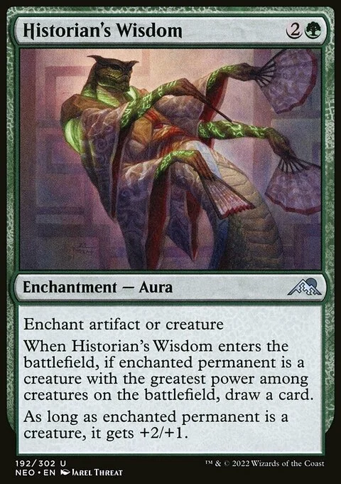 Enchant artifact or creature When Historian's Wisdom enters the battlefield, if enchanted permanent is a creature with the greatest power among creatures on the battlefield, draw a card. As long as enchanted permanent is a creature, it gets +2/+1.