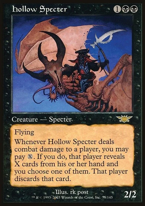 Flying Whenever Hollow Specter deals combat damage to a player, you may pay {X}. If you do, that player reveals X cards from their hand and you choose one of them. That player discards that card.