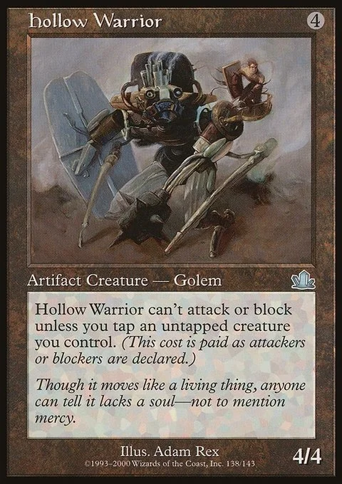 Hollow Warrior can't attack or block unless you tap an untapped creature you control not declared as an attacking or blocking creature this combat. (This cost is paid as attackers or blockers are declared.)