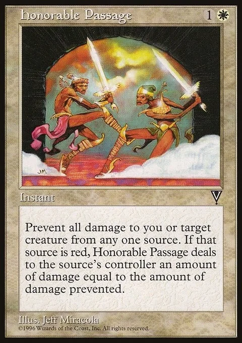 Prevent all damage to you or target creature from any one source. If that source is red, Honorable Passage deals to the source’s controller an amount of damage equal to the amount of damage prevented.