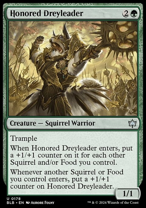 Trample When Honored Dreyleader enters, put a +1/+1 counter on it for each other Squirrel and/or Food you control. Whenever another Squirrel or Food you control enters, put a +1/+1 counter on Honored Dreyleader.