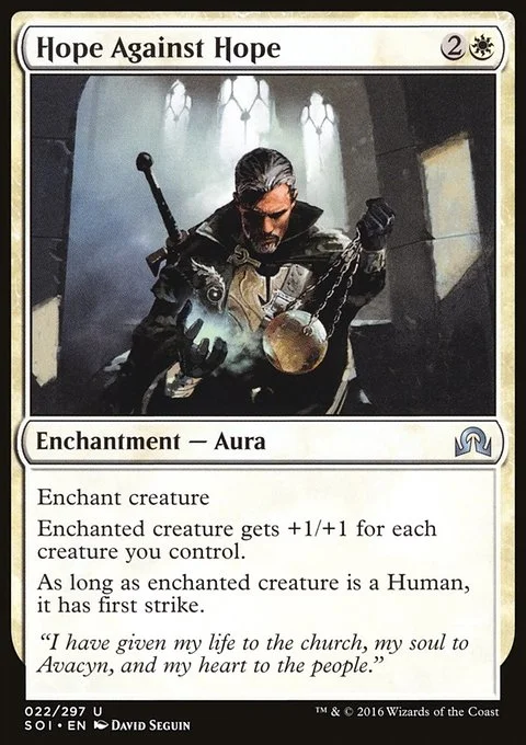 Enchant creature Enchanted creature gets +1/+1 for each creature you control. As long as enchanted creature is a Human, it has first strike.