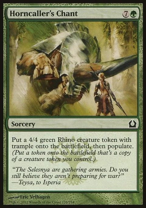 Create a 4/4 green Rhino creature token with trample, then populate. (Create a token that's a copy of a creature token you control.)