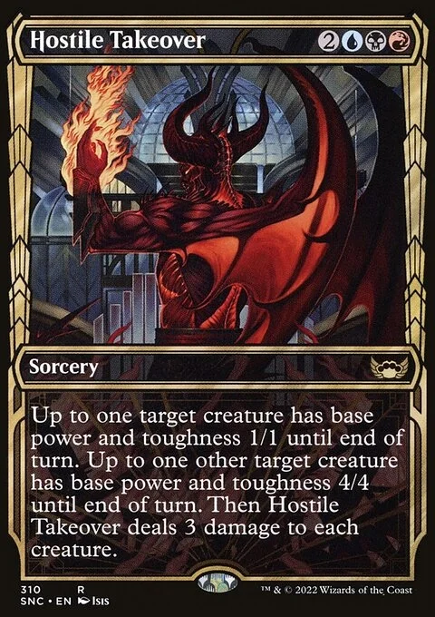 Up to one target creature has base power and toughness 1/1 until end of turn. Up to one other target creature has base power and toughness 4/4 until end of turn. Then Hostile Takeover deals 3 damage to each creature.