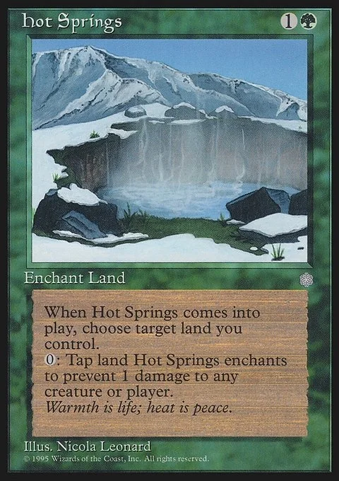 When Hot Springs comes into play, choose target land you control.0: Tap land Hot Springs enchants to prevent 1 damage to any creature or player.