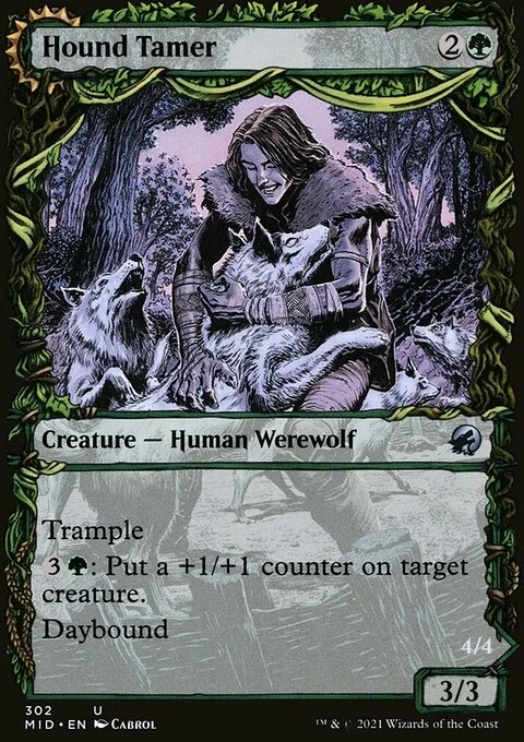 Hound Tamer Trample {3}{G}: Put a +1/+1 counter on target creature. Daybound (If a player casts no spells during their own turn, it becomes night next turn.) Untamed Pup Trample Other Wolves and Werewolves you control have trample. {3}{G}: Put a +1/+1 counter on target creature. Nightbound (If a player casts at least two spells during their own turn, it becomes day next turn.)
