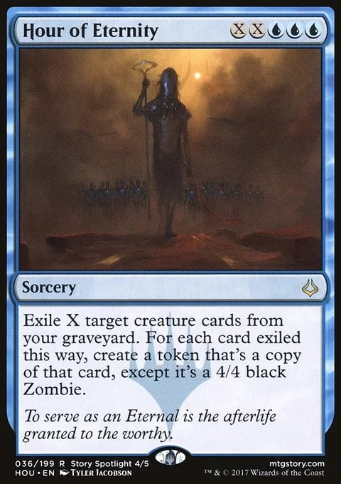 Exile X target creature cards from your graveyard. For each card exiled this way, create a token that's a copy of that card, except it's a 4/4 black Zombie.