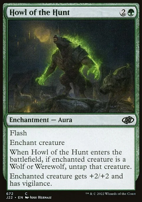 Flash Enchant creature When this Aura enters, if enchanted creature is a Wolf or Werewolf, untap that creature. Enchanted creature gets +2/+2 and has vigilance.