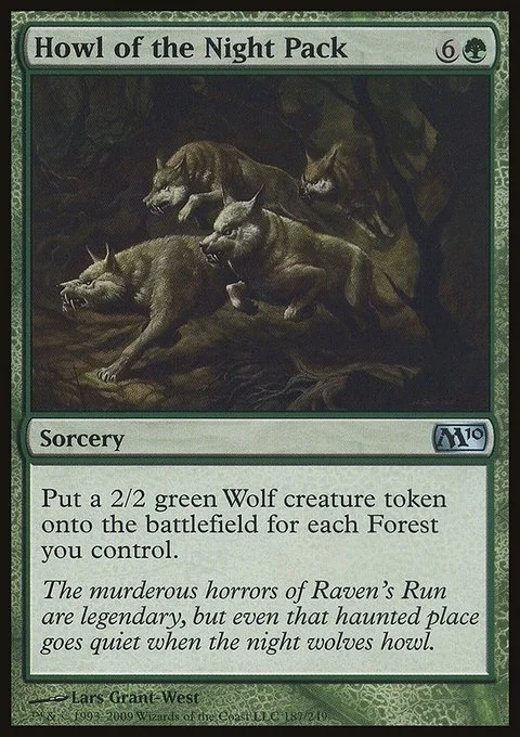 Create a 2/2 green Wolf creature token for each Forest you control.