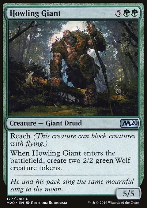 Reach (This creature can block creatures with flying.) When Howling Giant enters the battlefield, create two 2/2 green Wolf creature tokens.