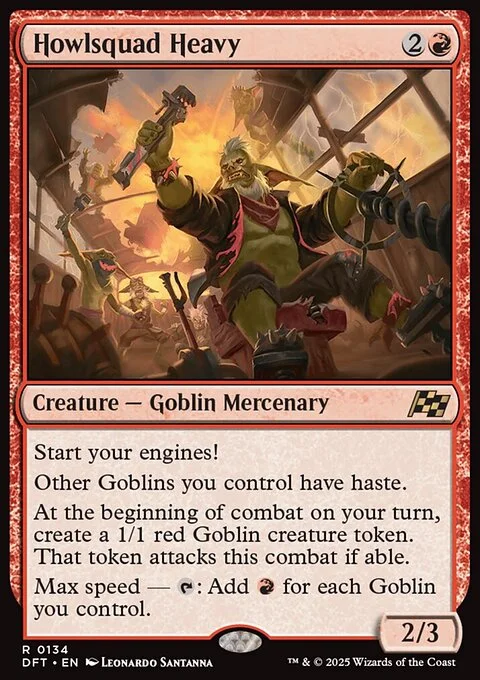 Start your engines! Other Goblins you control have haste. At the beginning of combat on your turn, create a 1/1 red Goblin creature token. That token attacks this combat if able. Max speed — {T}: Add {R} for each Goblin you control.