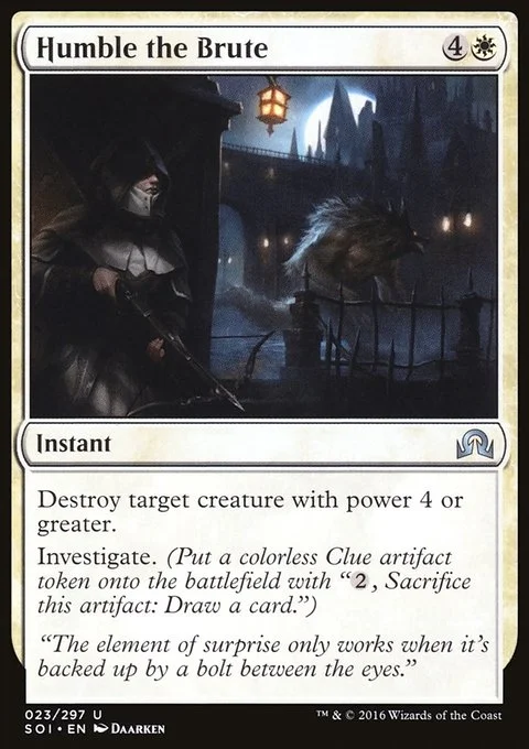 Destroy target creature with power 4 or greater. Investigate. (Create a Clue token. It's an artifact with "{2}, Sacrifice this artifact: Draw a card.")